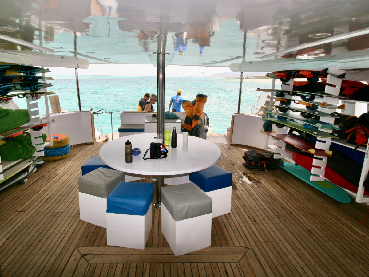 • Das Boot ist speziell auf Wassersport ausgerichtet z.B mit Regalen für Kiteboards und Kites/Wings, Kompressor, Rescue-Zodiac, Start-/Landeplattform
