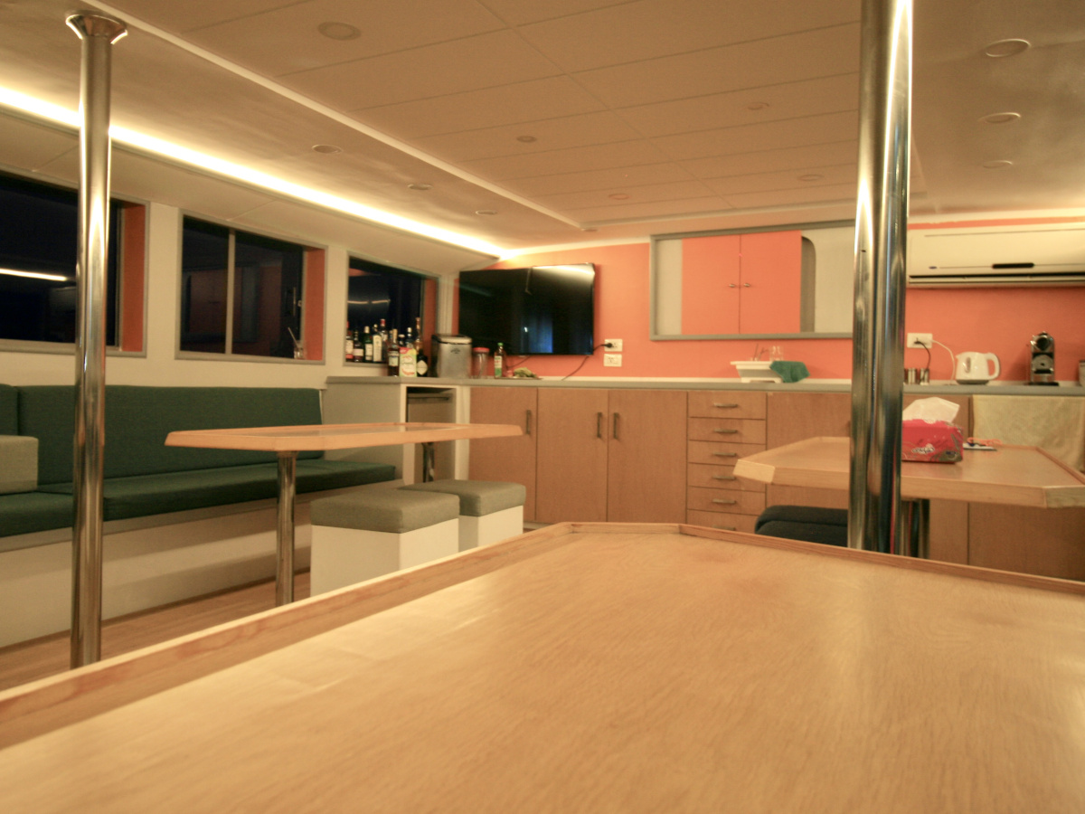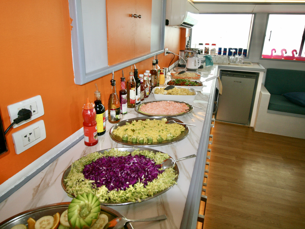 Sobald die magischen Worte des Küchenchefs mit «Food is Ready!» erklingen, wird der Salon Treffpunkt der hungrigen Wassersportler*innen. Am Buffet finden unsere Gäste ein Angebot verschiedener Speisen. Gerne nehmen wir auch auf vegetarische, vegane, lactose- oder glutenfreie Ernährungsweisen oder Allergien Rücksicht.