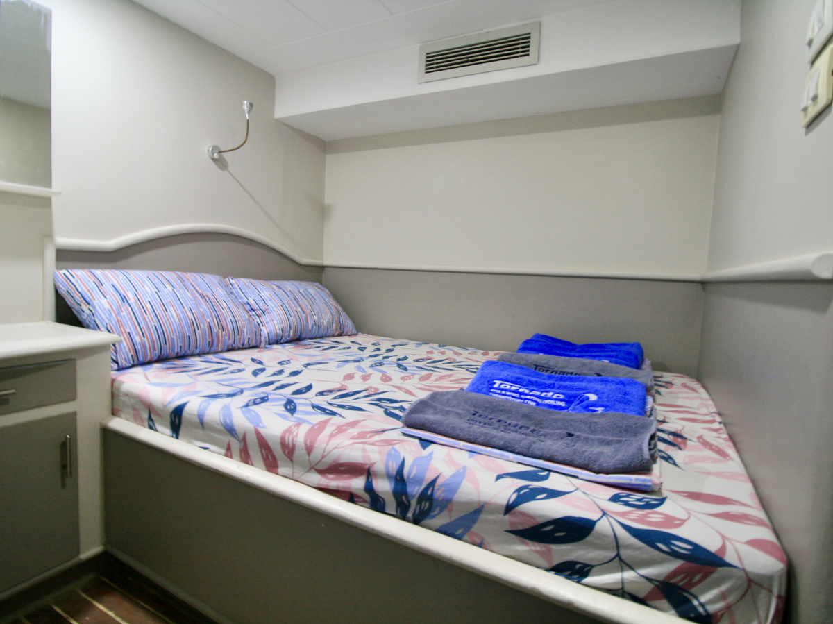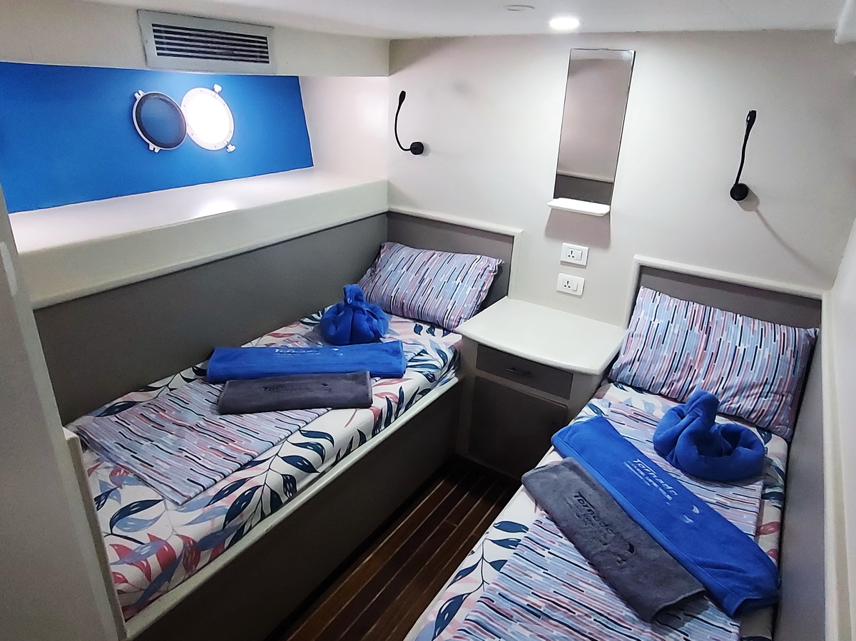 • Kabinen mit eigenem Bad inklusive Dusche (warmes/kaltes Süsswasser) und WC, Stauraum, 2-poligen Steckdosen und Klimaanlage